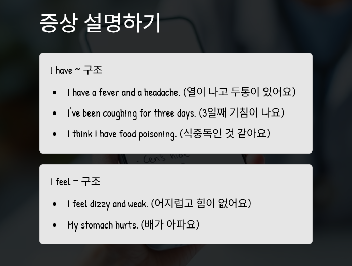 증상 설명, 진료 요청, 약 구매 등 상황별 필수 표현을 정리해드립니다.