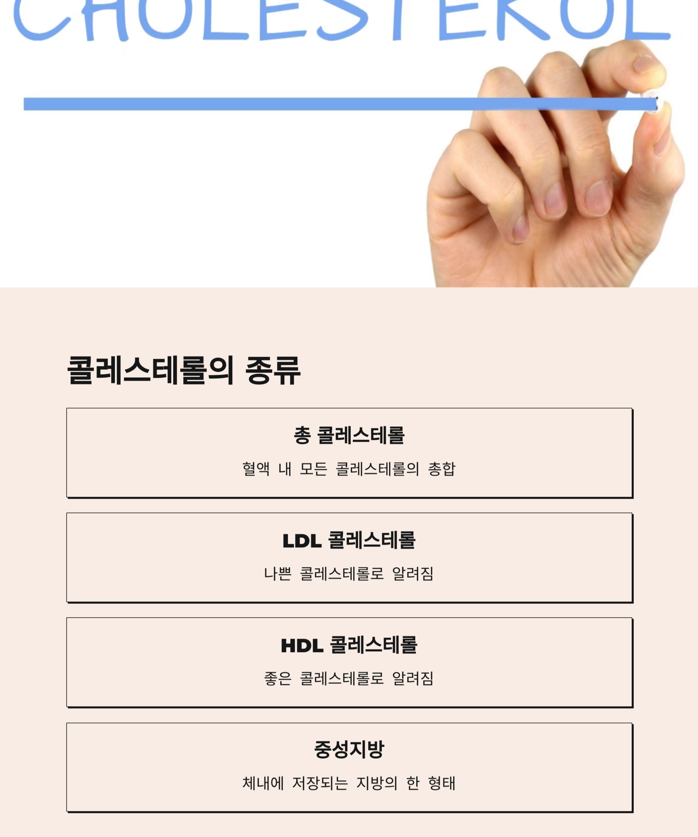 크게 나눠보면 총 콜레스테롤, LDL 콜레스테롤, HDL 콜레스테롤, 중성지방이 있습니다.