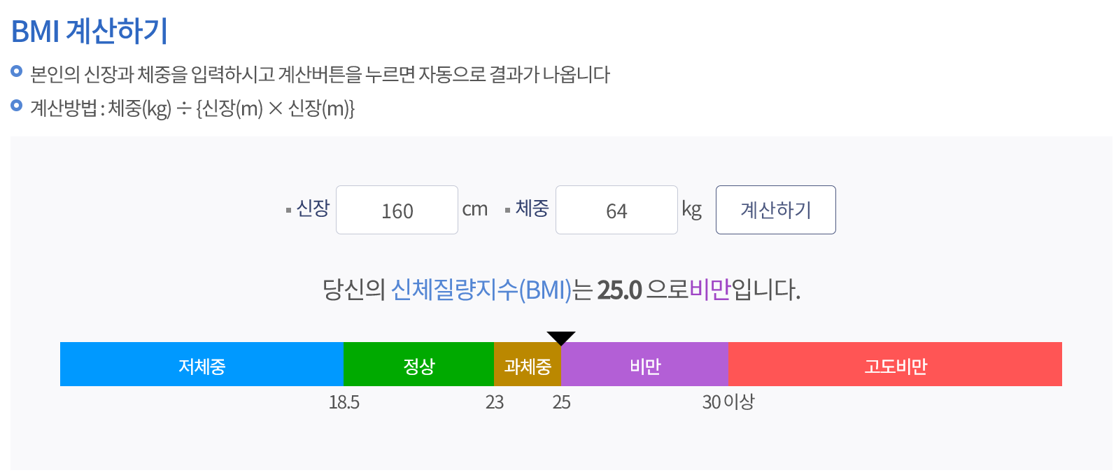 이렇게 계산된 BMI 수치를 통해 자신의 체형 상태를 확인할 수 있어요.